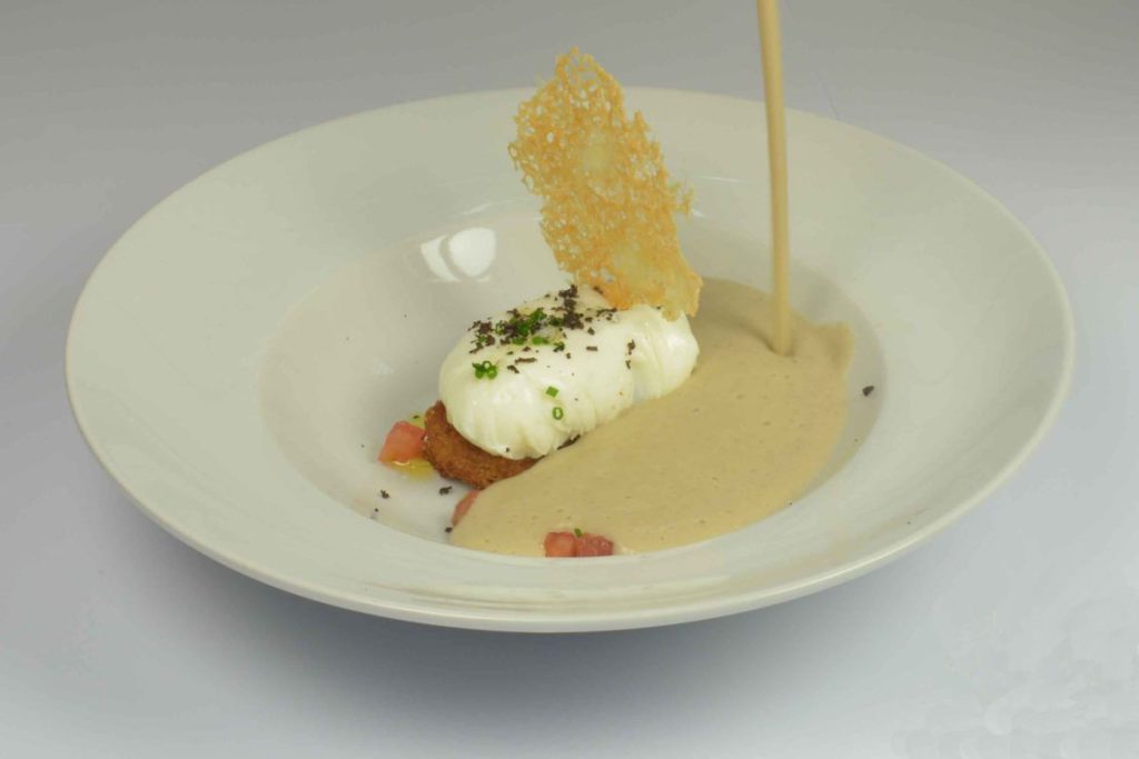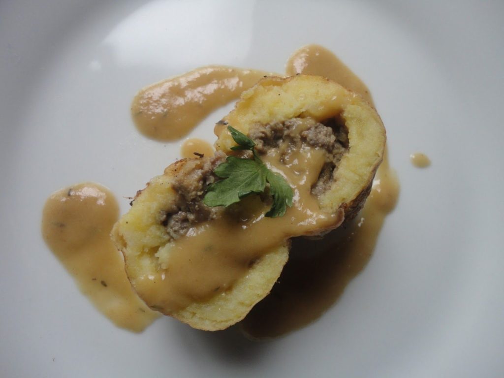 Patata rellena de trufa y jamón ibérico con salsa de foie
